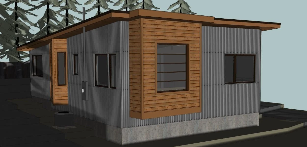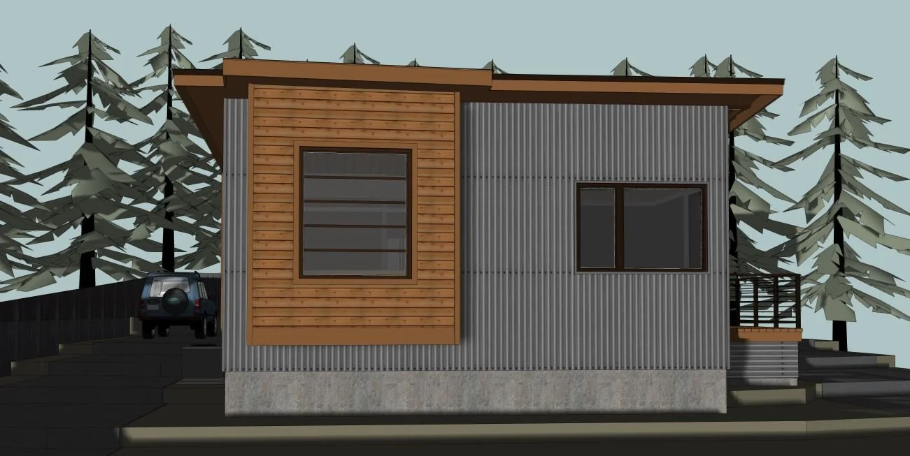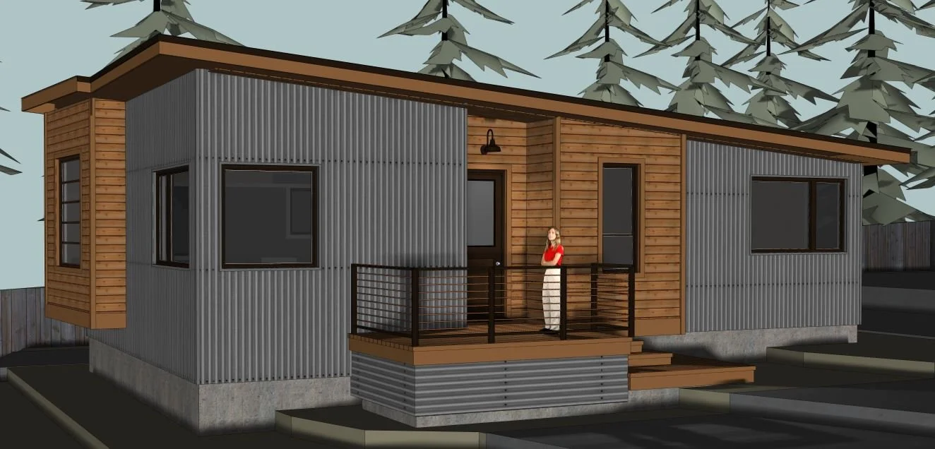 Project Description: The Tilden House is a wood-frame Single Story open floor plan home with 2 bedrooms, 1 bathroom, and an office. The house is designed to be situated on a raised foundation and features an entry deck with steps.